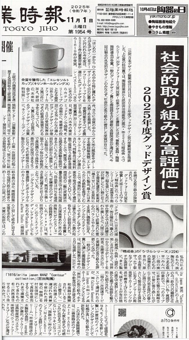 2025年11月1日付の陶業時報で、「uzra(うづら)」シリーズのグッドデザイン賞受賞が取り上げられました。